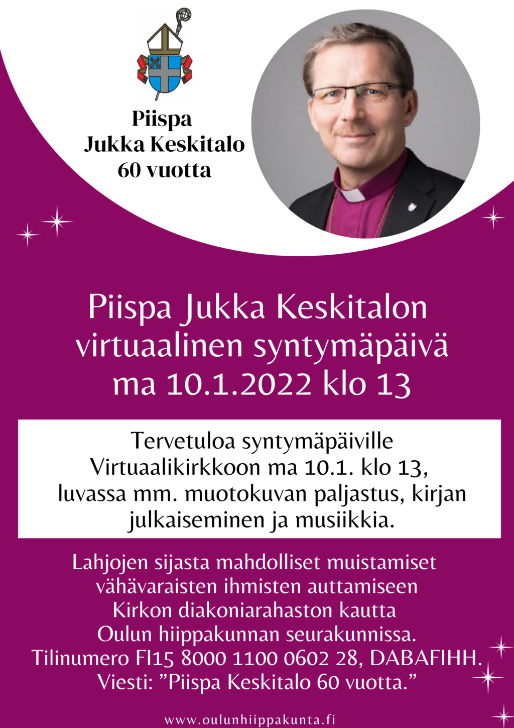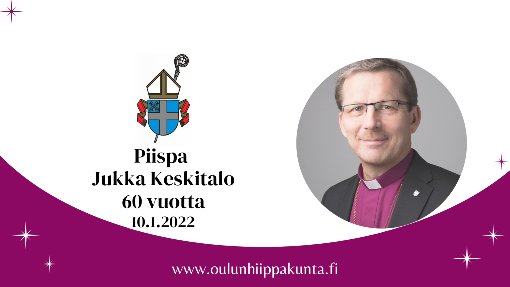 Oulun hiippakunnan piispa Jukka Keskitalo täyttää 60 vuotta 10.1.2022. Juhlallisuuksien avoimet tilaisuudet eli syntymäpäiväkonsertti ja Risteyksissä-juhlaseminaari on peruttu akuutisti huonontuneen koronatilanteen vuoksi.