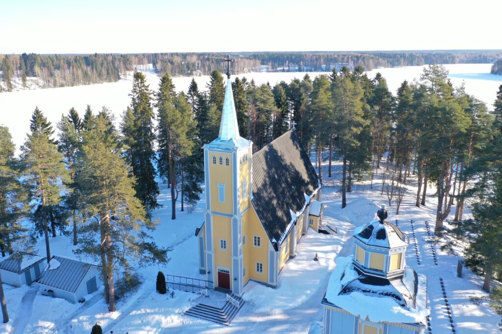 Kuva 1: Muhoksen kirkko ilmasta. Kuvaaja Valto Savolainen.