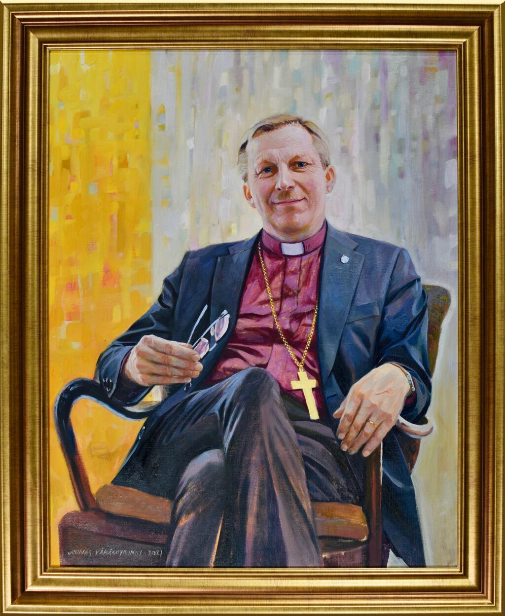 – Tavoitteena oli luoda piispasta tunnistettava näköiskuva. Vaikka teos sijoittuu perinteiseen muotokuvamaalaamisen traditioon, on se silti hyvin tässä päivässä kiinni, Vähäsöyrinki sanoo.