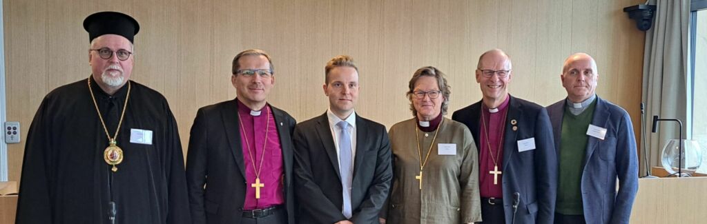 Kuva: Pohjoisten hiippakuntien piispat yhteiskuvassa tiede- ja kulttuuriministeri Petri Honkosen kanssa. Kuvaaja Pekka Mustakallio. Vasemmalta: metropoliitta Elia, piispa Jukka Keskitalo, ministeri Petri Honkonen, piispa Åsa Nyström, piispa Olav Øygard, piispan sijainen Gunnar Bråthen.