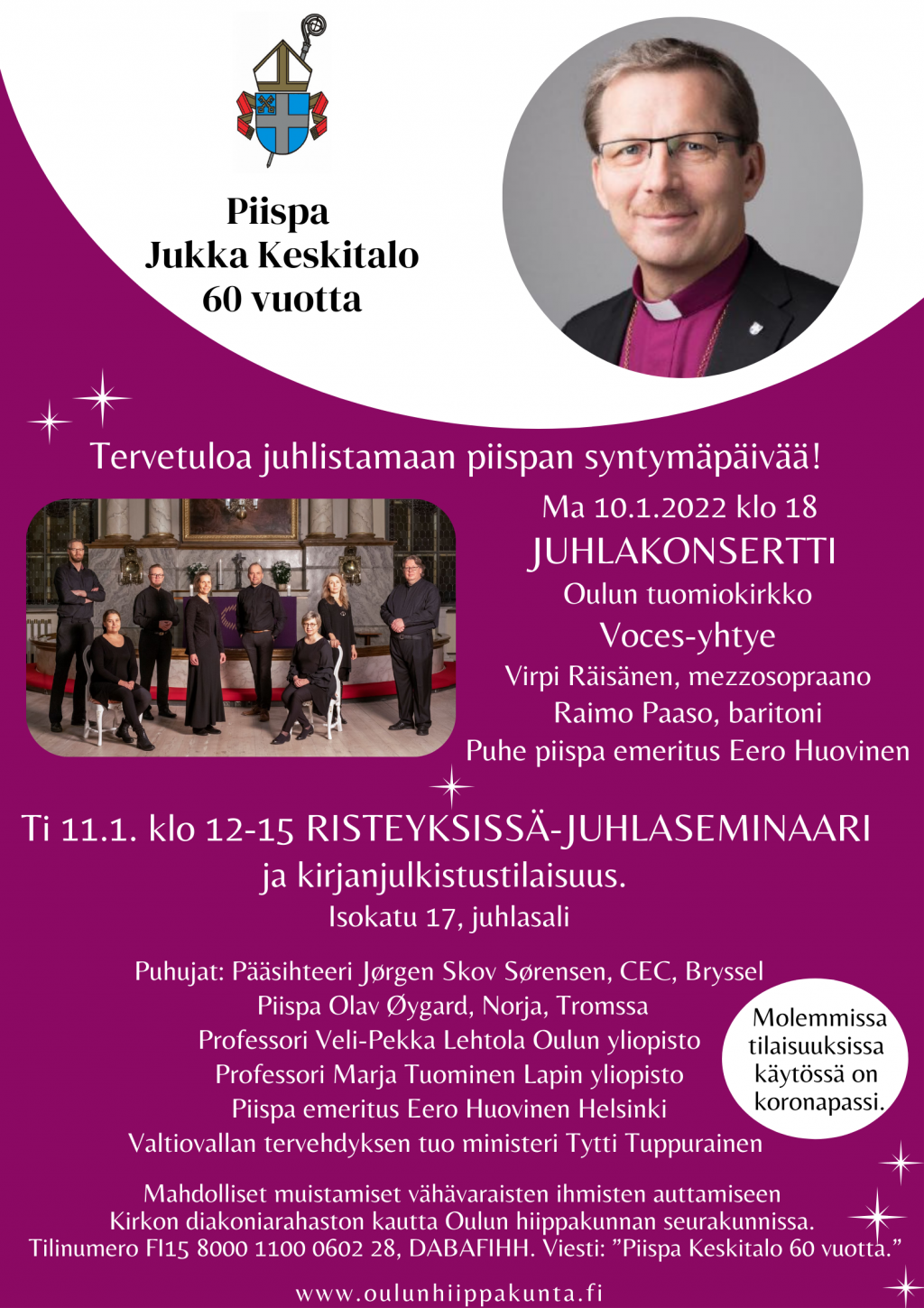 Oulun hiippakunnan piispa Jukka Keskitalo täyttää 60 vuotta 10.1.2022. Merkkipäivän juhlistamiseen on mahdollisuus kahdessa avoimessa tilaisuudessa, joissa piispa on läsnä.