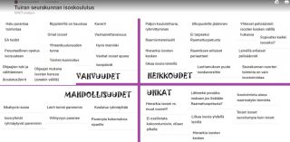 Toisella kerralla paikalla olivat neuvoston jäsenten lisäksi työntekijöistä nuorisotyönohjaajat Terhi-Liisa Sutinen ja Tiina Siloaho. Tällä kerta pureuduimme vielä syvemmin isoskoulutuksen vahvuuksiin ja heikkouksiin SWOT-analyysin kautta. Pohdiskelimme, mikä koulutuksessa on ollut hyvää ja missä olisi vielä kehitettävää. Isosille tärkeintä koulutuksessa olivat leirit sekä muut isoset ja nuoret. Yhdessä tehdystä analyysistä nousi monia hyviä asioita, mutta myös kehittämisen paikkoja. Nuorten havainnot olivat varsin tarkkanäköisiä ja monilta osin yhteneväisiä työntekijöiden ajatusten kanssa.