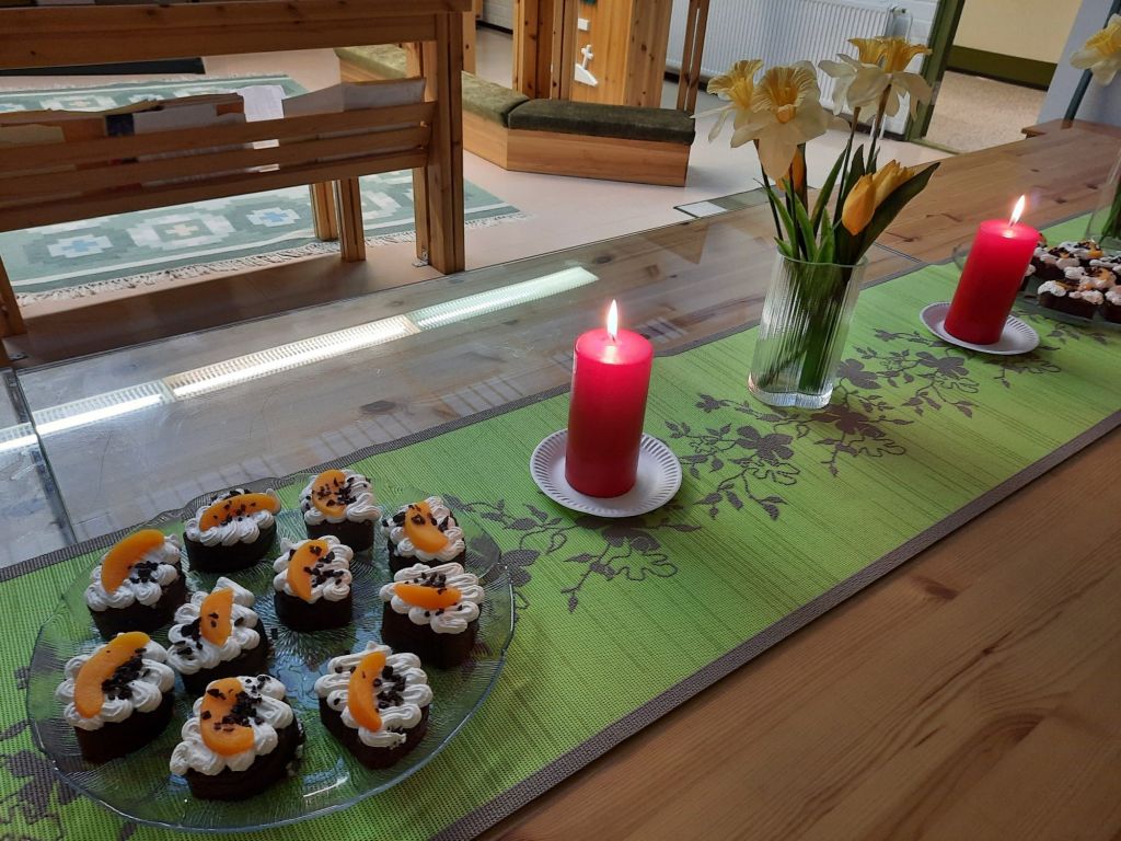 Päätimme tilaisuuden juhlallisesti leivoskahvilla. Iloisen puheensorinan taustalla soi hiljaisesti hengellinen kitaramusiikki.