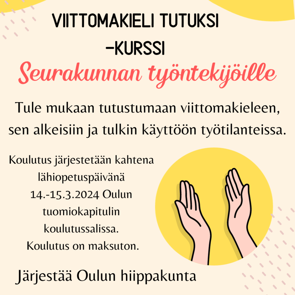 Viittomakieli tutuksi-kurssi on tarkoitettu kaikille Oulun hiippakunnan alueen seurakunnan työntekijöille, jotka tarvitsevat työssään tai haluavat oppia viittomakielen alkeita ja tulkin käyttöä. Kurssilla perehdytään viittomakieleen kommunikaatiotapana sekä kuuron kohtaamiseen ja tulkin käyttöön työtilanteissa, opetellaan sormiaakkoset ja yksinkertaisia viittomia. Kurssin opettajana toimii Emmi Ruukki-Laukka.