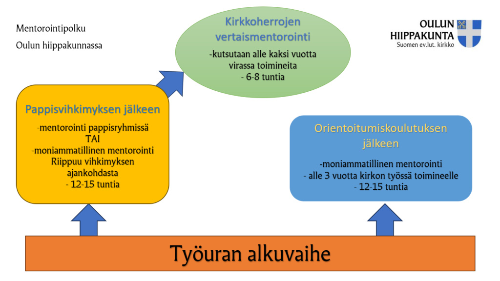 Oulun hiippakunnassa mentorointi käynnistyy kasvotusten ja tapahtuu sähköisellä alustalla etäkokouksina ja väliajantehtävinä. Mentorointisuhde perustuu avoimuuteen, molemminpuoliseen luottamukseen ja tasa-arvoisuuteen. Mentorointi antaa hyvän alun työuralle ja mahdollisuuden käsitellä siihen sisältyviä kysymyksiä kannustavassa ilmapiirissä.