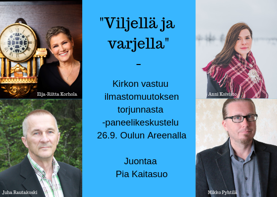 10.40 ”Viljellä ja varjella” – Kirkon vastuu ilmastonmuutoksen torjunnassa -paneelikeskustelu. Mukana Eija-Riitta Korhola, Juha Rautakoski, Anni Koivisto ja Mikko Pyhtilä. Paneelin juontaa toimittaja Pia Kaitasuo.