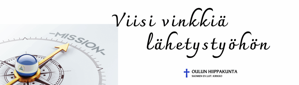 Tämä on Oulun hiippakunnan VIISI VINKKIÄ LÄHETYSTYÖHÖN -sivusto. Vinkeissä on viisi arjen työtä helpottavaa vinkkiä 15 eri kohderyhmälle tai näkökulmalle siitä, miten lähetystyön ja kansainvälisen vastuun näkökulmia voi pitää luontevasti ja innostavasti esillä seurakuntatyössä. Viiden vinkin jälkeen on myös linkit eri kirkon sopimusjärjestöjen materiaaleihin ko. kohderyhmää koskien.